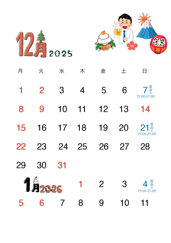12月と年始の営業カレンダーが完成しました。