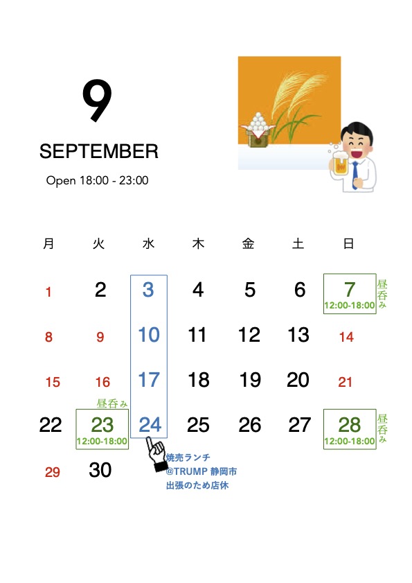 9/7 9/23 9/28 3回の昼呑み営業(12:00 – 18:00)もお楽しみください。